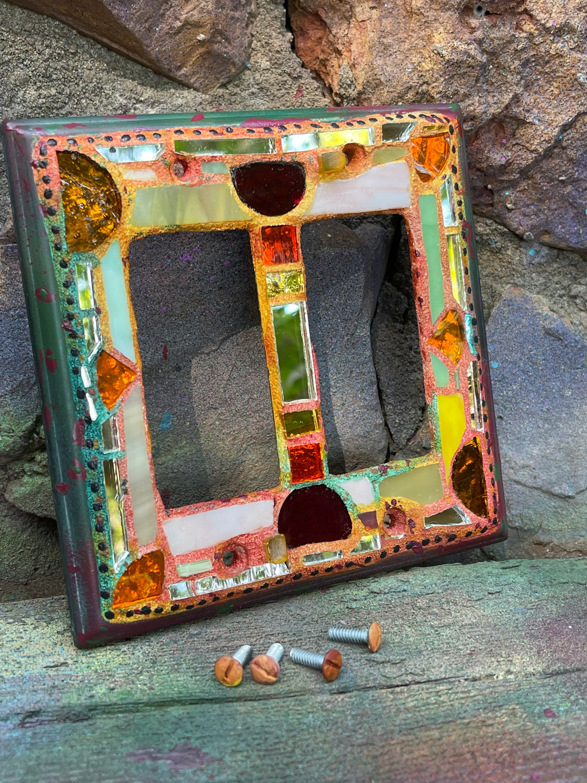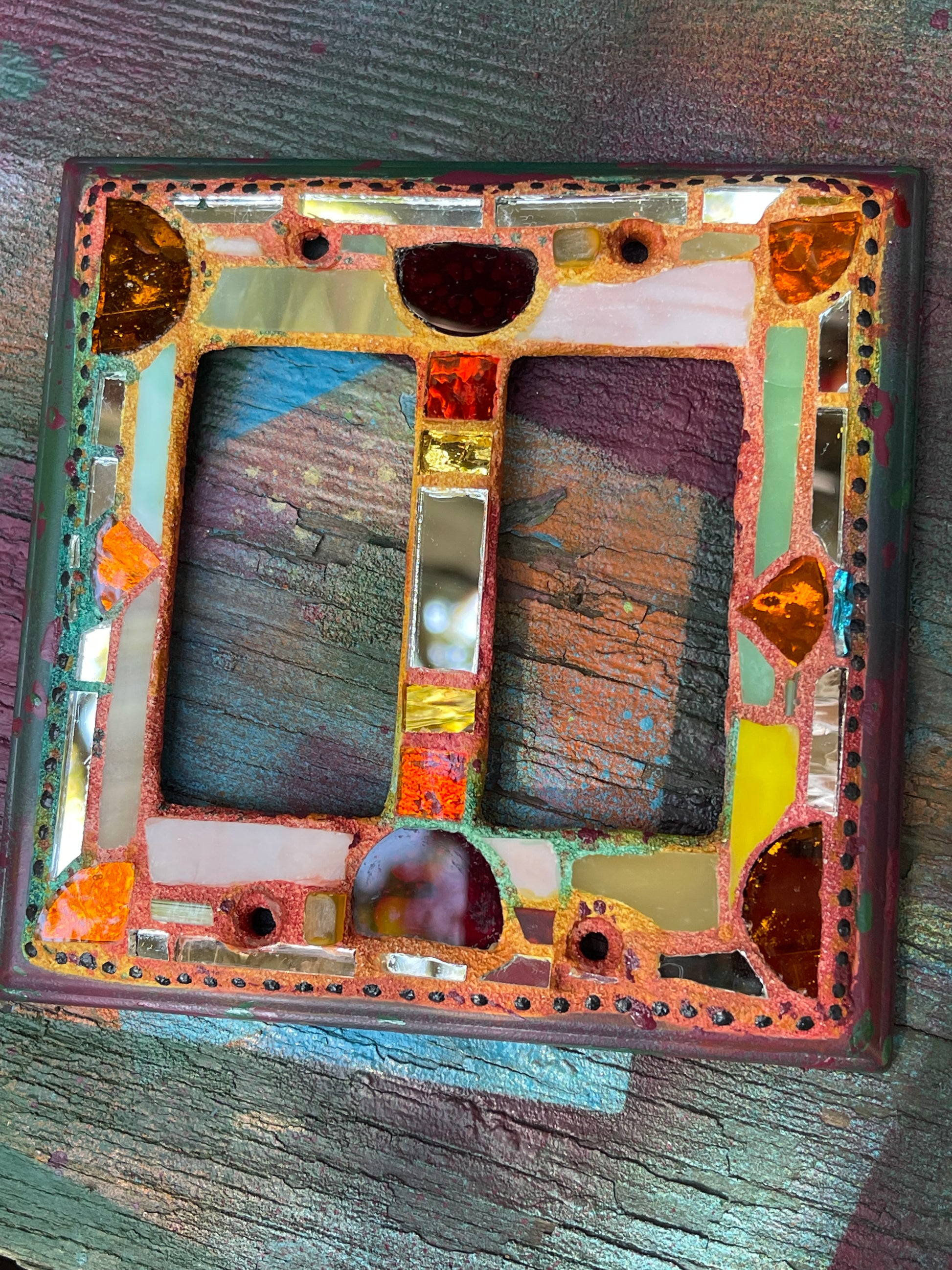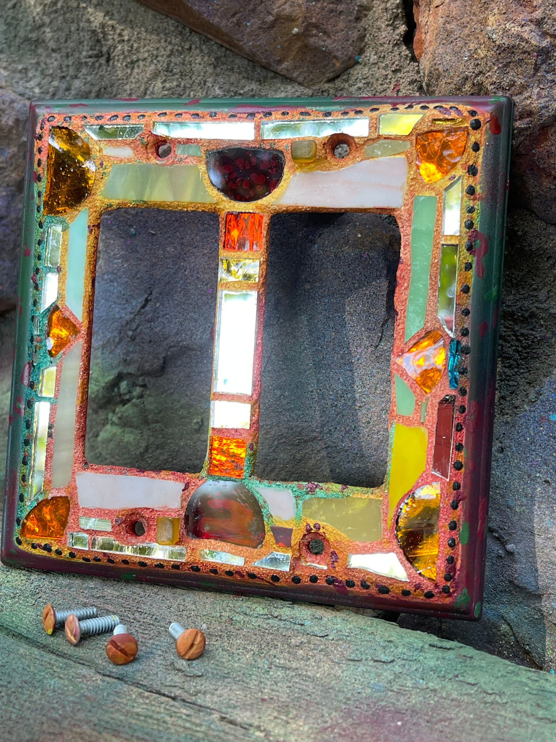 with silver and colored mirrors that surprise the eye when light struck. Rusts, orange, greens, evoke fall coziness. Lights up a room literally and figuratively. Totally one of a kind. Metal cover base. Standard double rocker size.