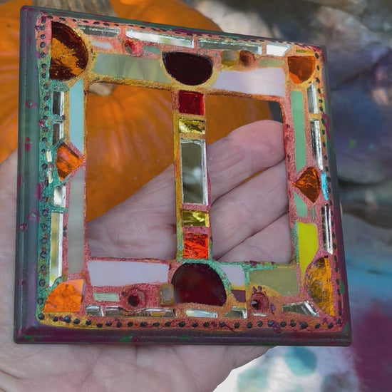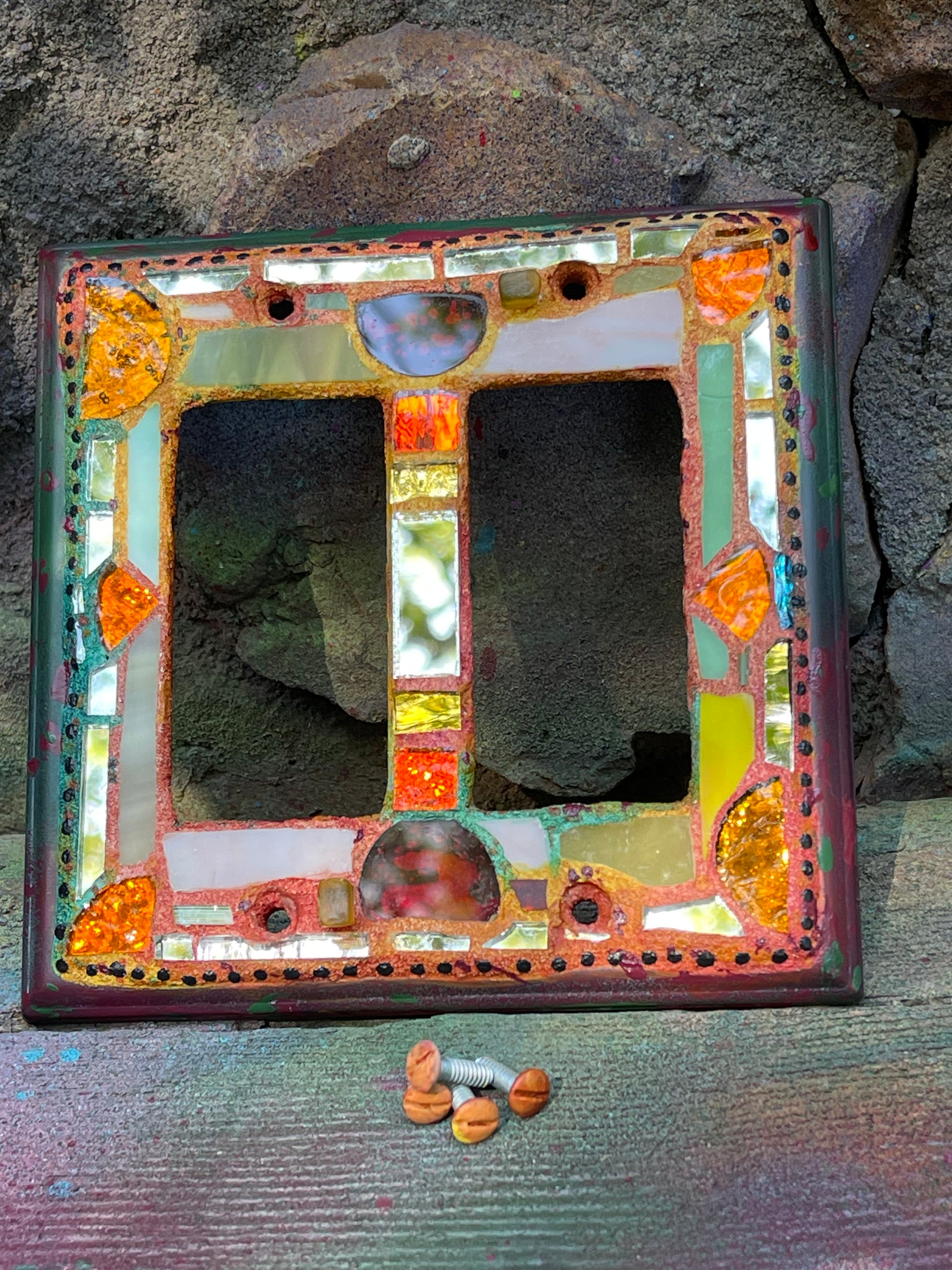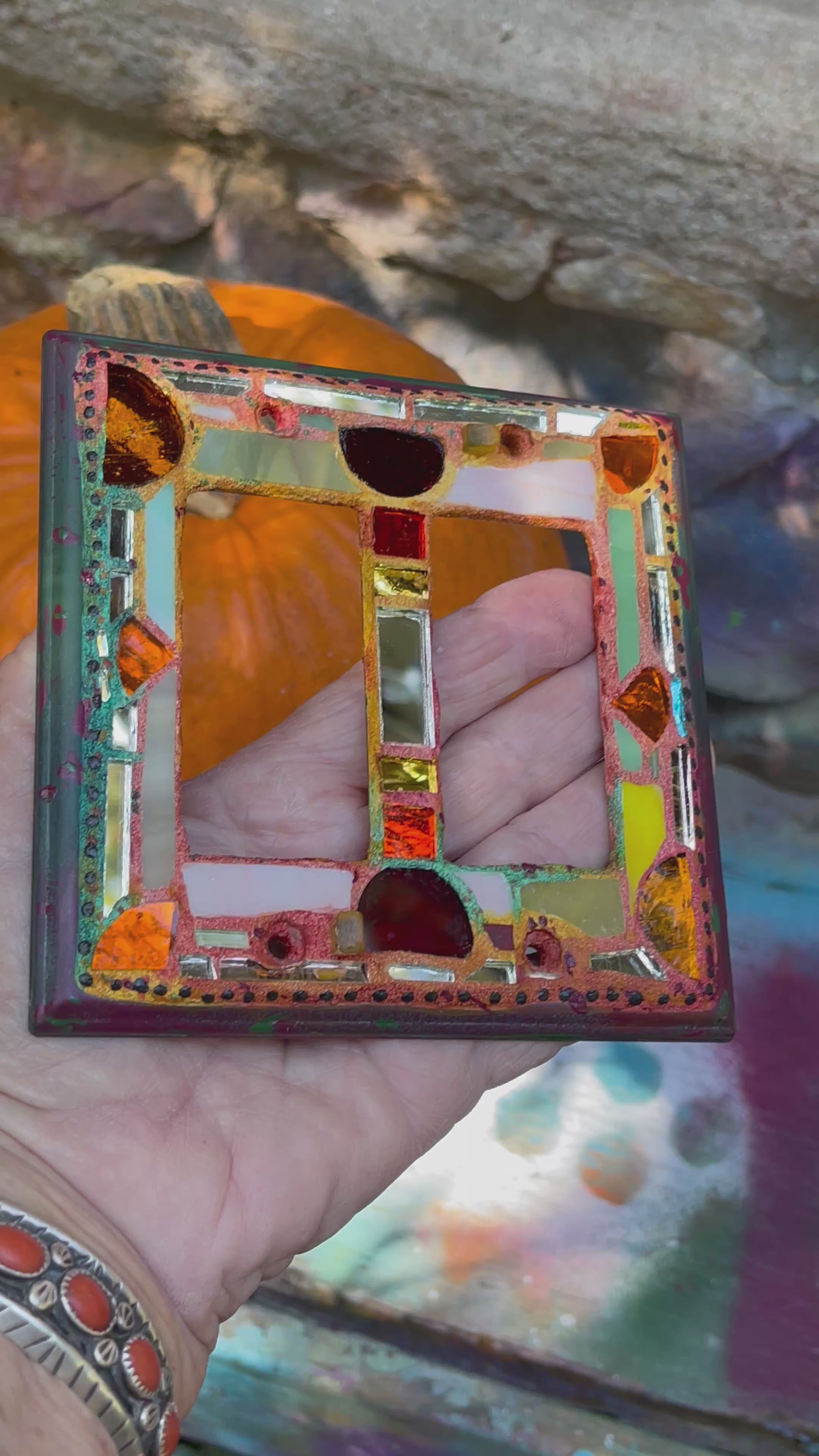 with silver and colored mirrors that surprise the eye when light struck. Rusts, orange, greens, evoke fall coziness. Lights up a room literally and figuratively. Totally one of a kind. Metal cover base. Standard double rocker size.