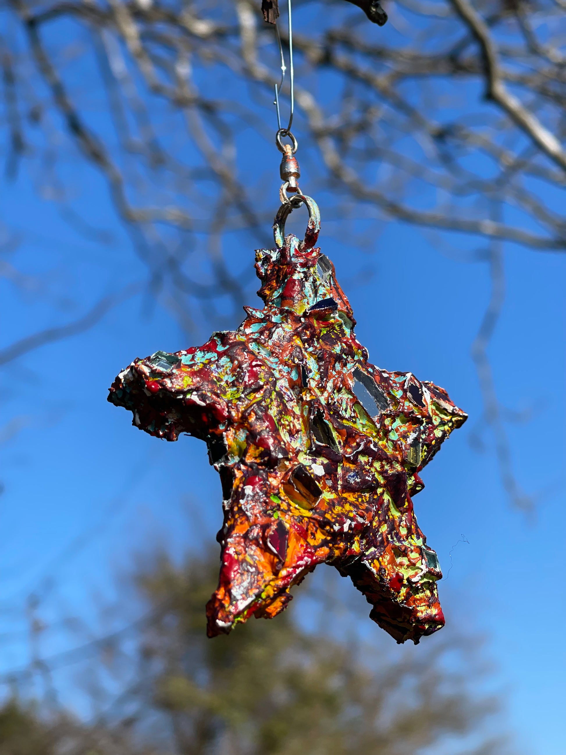 Star cut from repurposed cardboard boxes covered in hammered bottle caps and studded with colorful mirror bits will sparkle on tree, wreath or hanging free. One star arm quirkily bent. Beautiful industrial eco-friendly ornament. One of a kind.