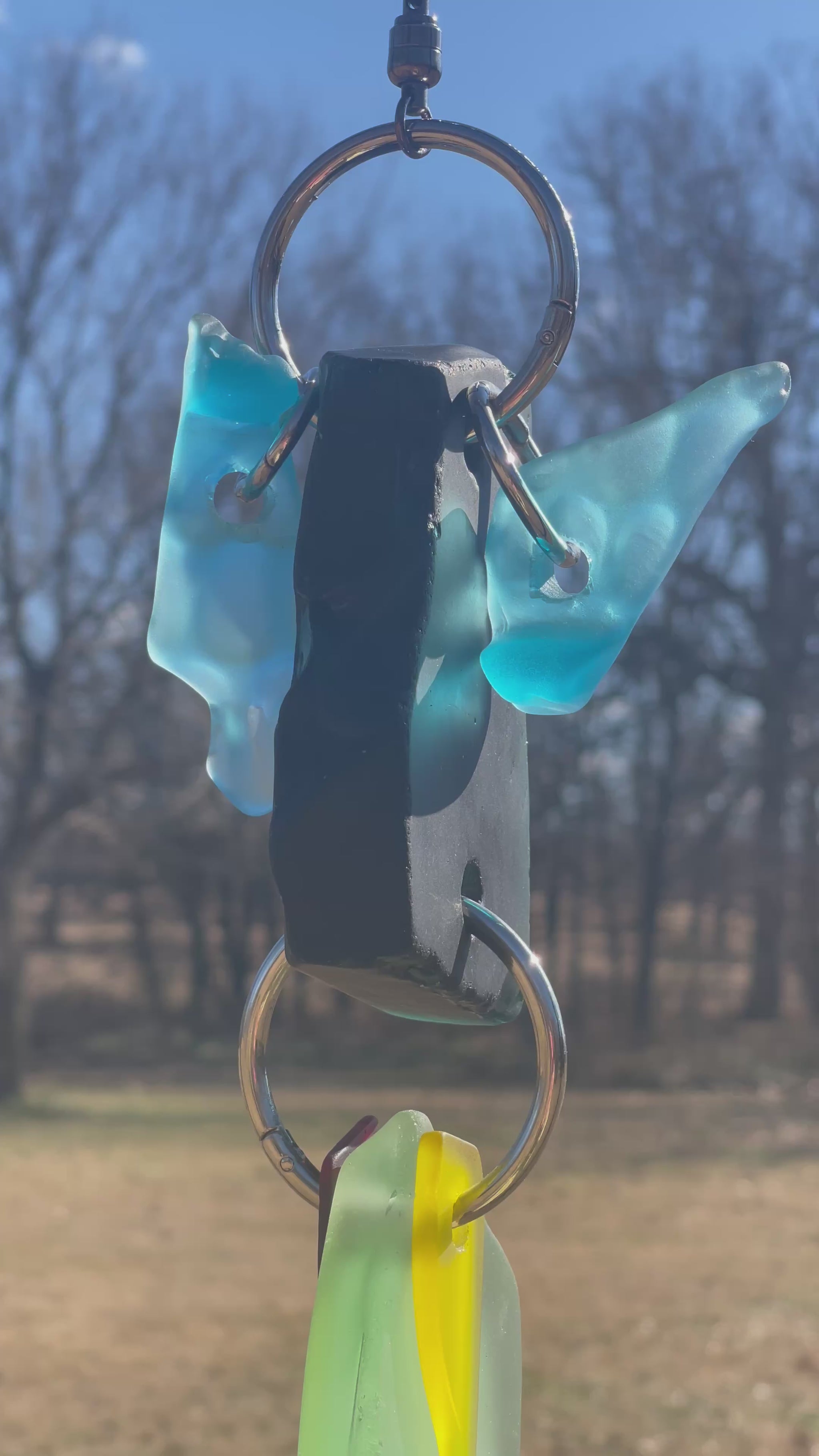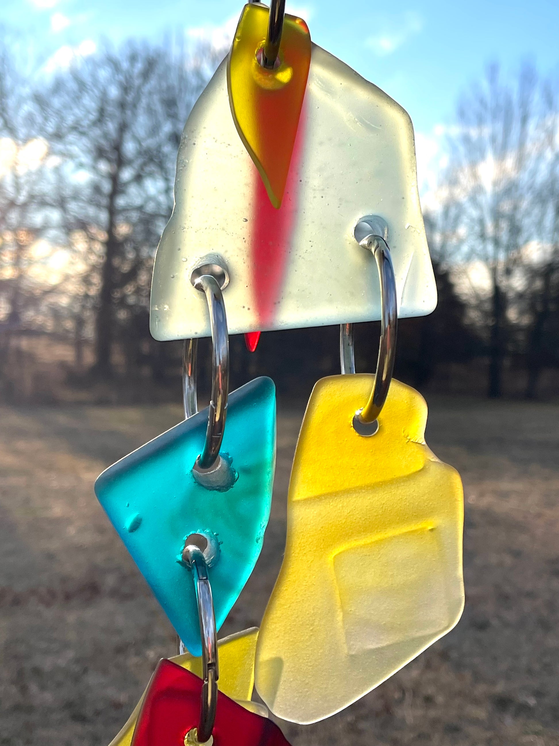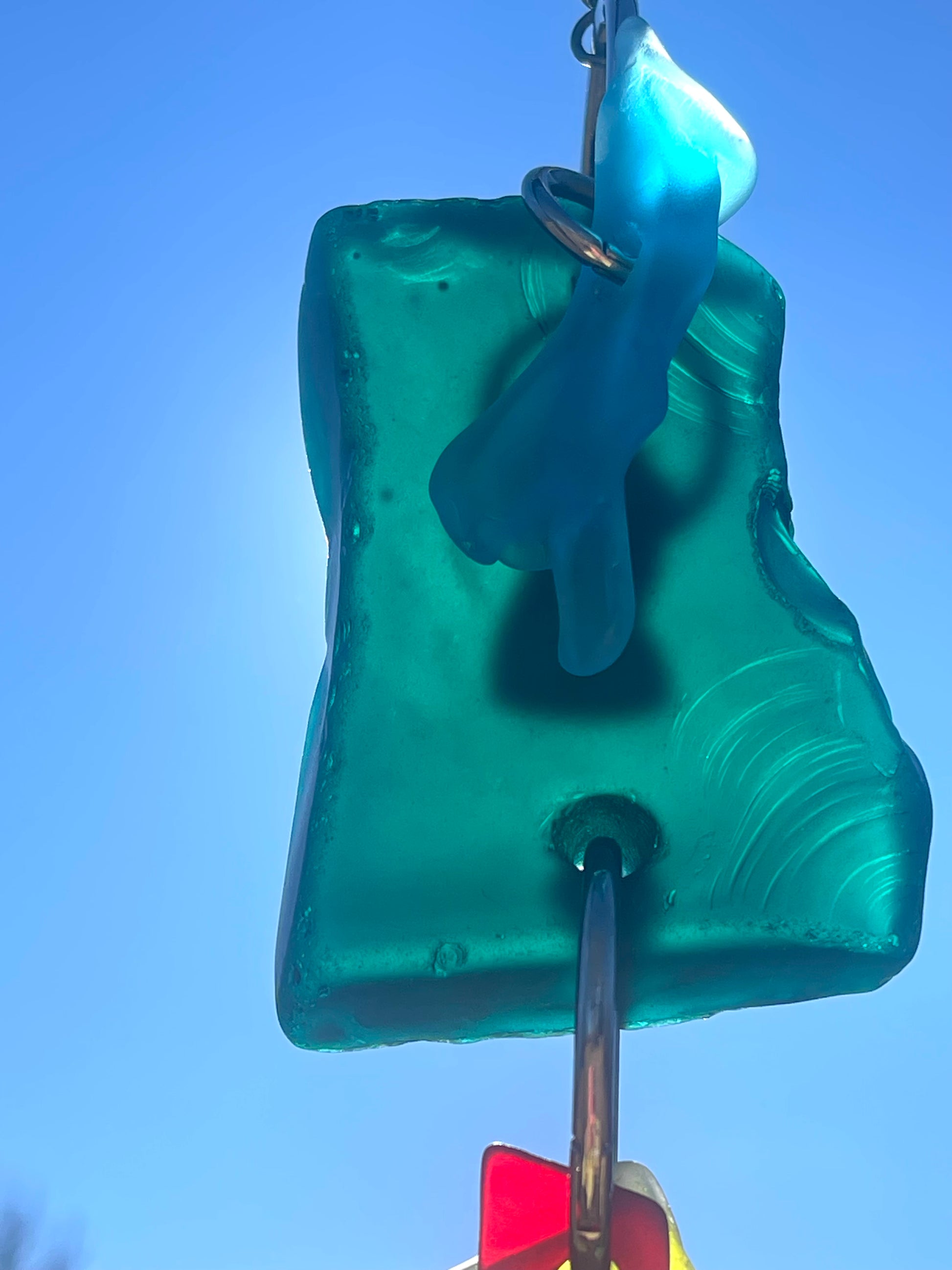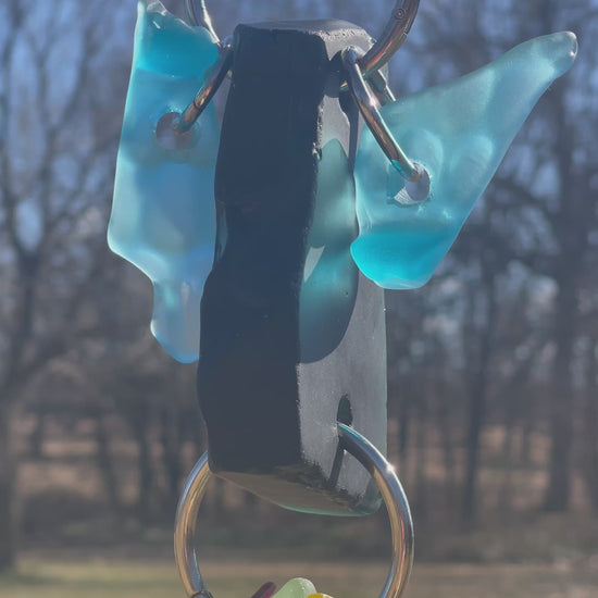 There are 2 primary glass components, and a scattering of glass doodads adding up to 20” of glowing glass, weighing just about 2.5 pounds. A buttery yellow glass drop features a molded square, a bit of geometry in a flowing sun catcher of curves and soft edges. Blue wave glass ears bookend the top deep green head piece. A repurposed glass plate shard glows boldly.