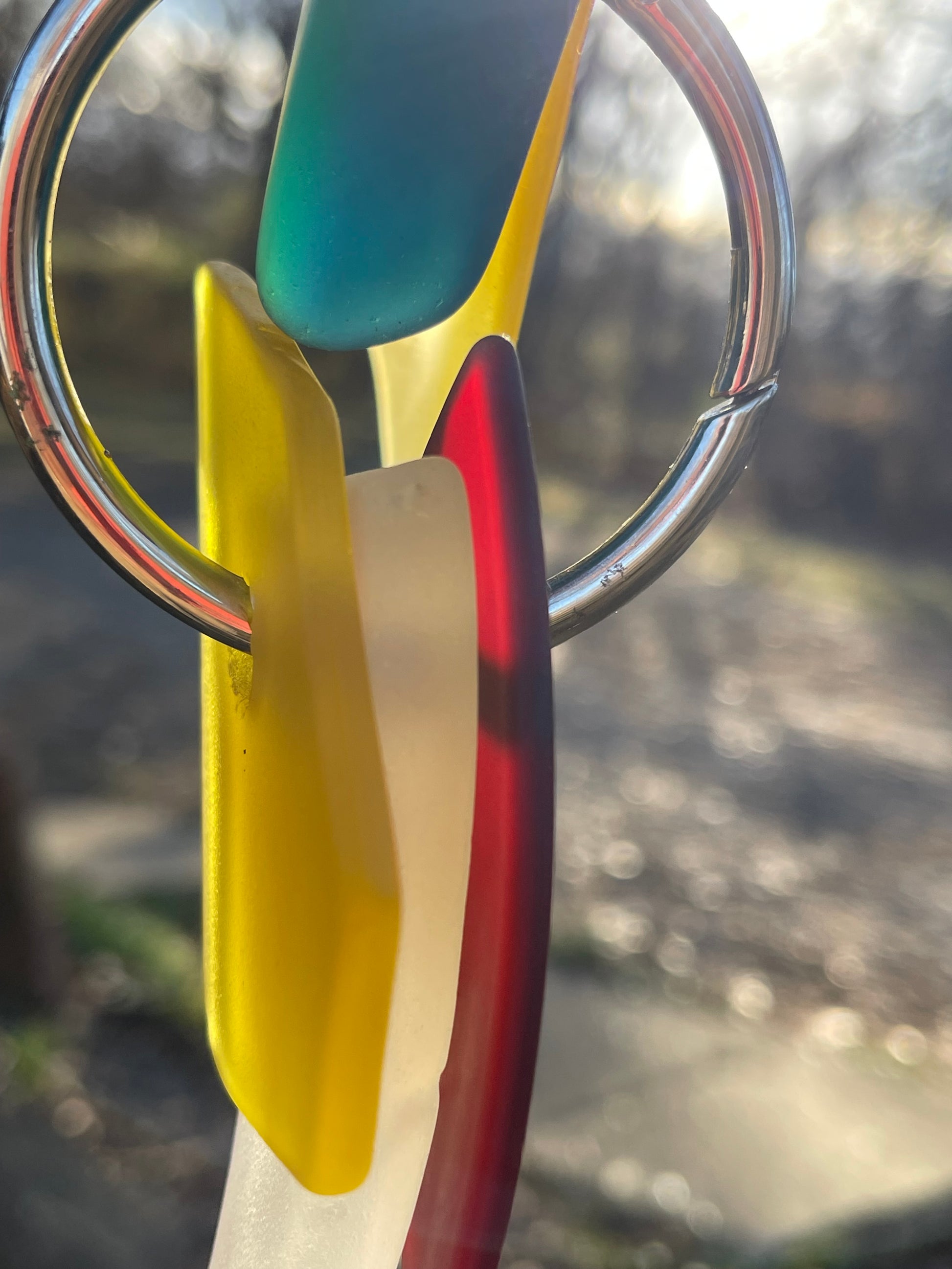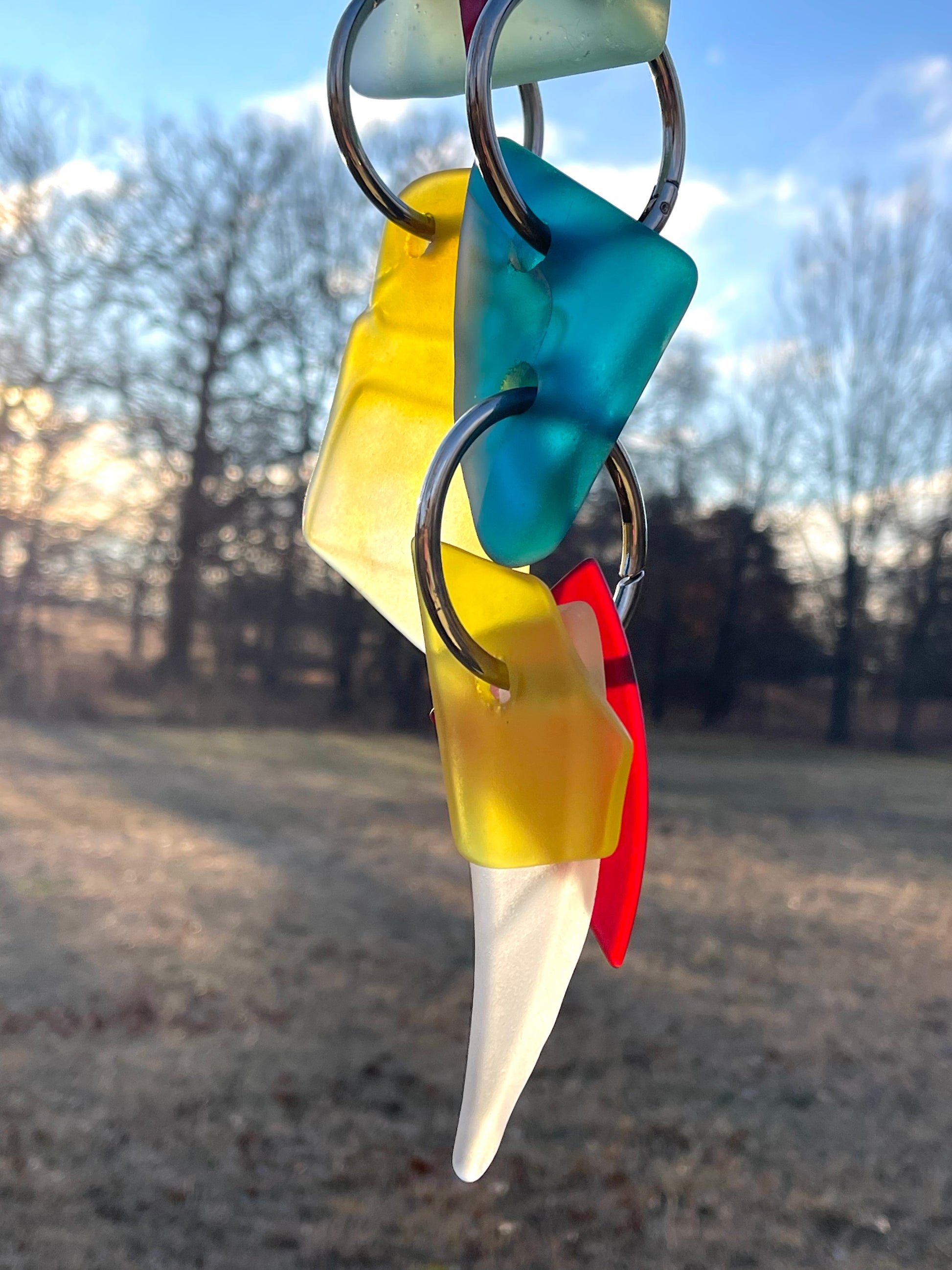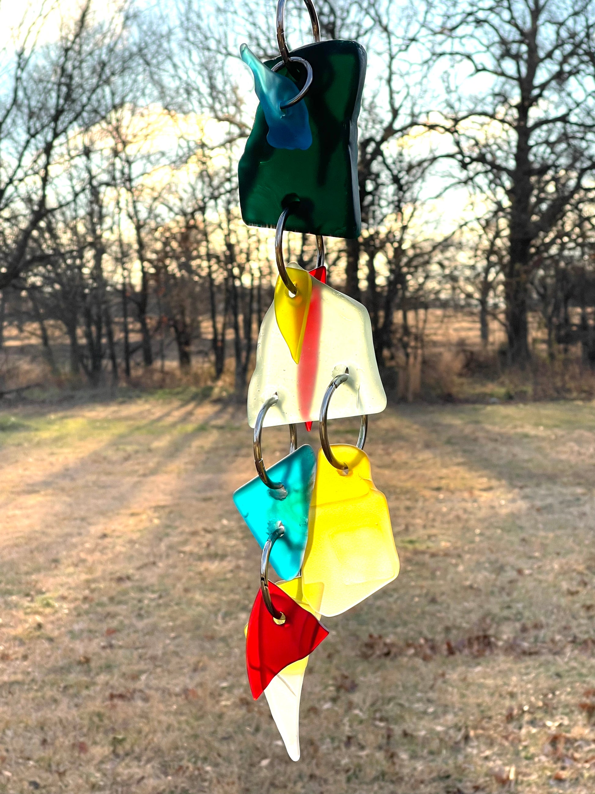 There are 2 primary glass components, and a scattering of glass doodads adding up to 20” of glowing glass, weighing just about 2.5 pounds. A buttery yellow glass drop features a molded square, a bit of geometry in a flowing sun catcher of curves and soft edges. Blue wave glass ears bookend the top deep green head piece. A repurposed glass plate shard glows boldly.