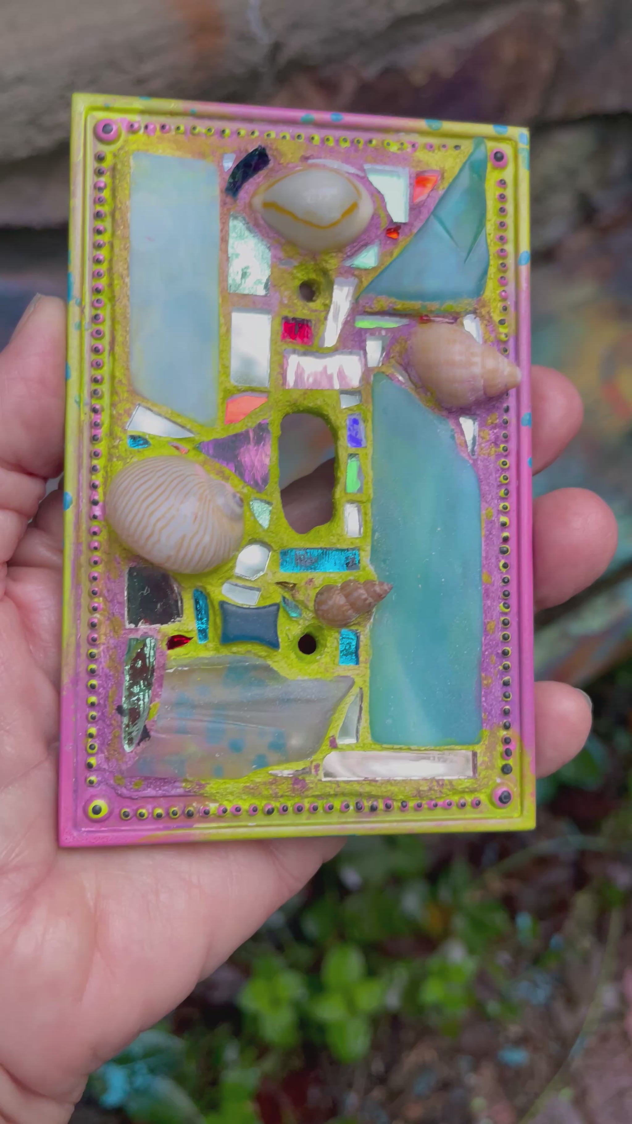 The mundane made beautiful. Single toggle contemporary mirror mosaic light switch cover with gorgeous vintage glass including a glass rain cloud, mirror bits and sea shells. Lights up a room literally and figuratively. Totally one of a kind. Metal cover base. Standard single toggle size: 4-15/16" x 2-7/8".